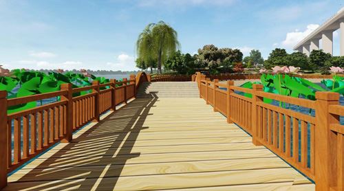以荷花為主題,堤岸打造木棧道,河岸搭配蘆葦等植物,充分發揮綠地效益。